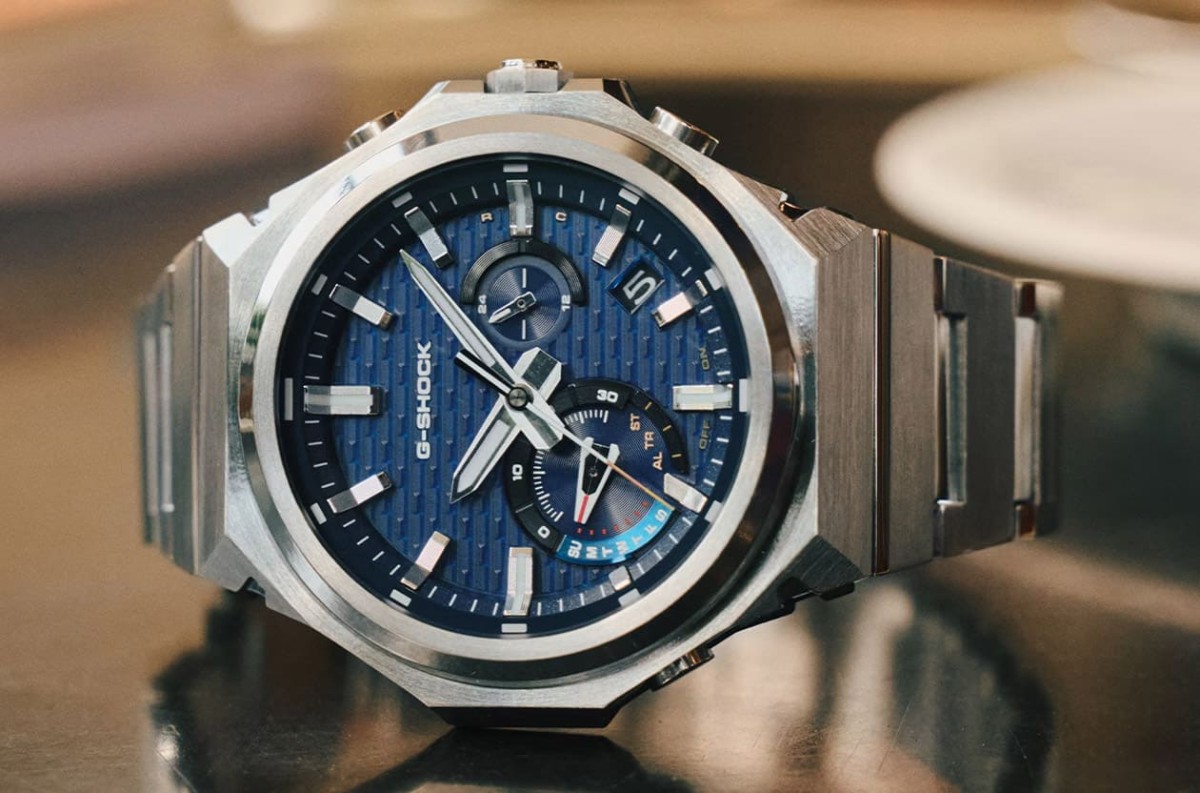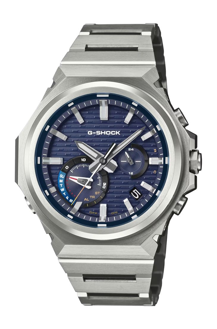 跨入萬元門檻後,G-SHOCK的金屬工藝開始展現成熟度,GST-B1000D-2A被日本媒體認為是今年「極簡系」的高分作品,最醒目的特色在於「無字錶圈」設計,把傳統G-SHOCK上的文字標示全部拿掉,只留下垂直髮絲紋、環狀髮絲紋與鏡面拋光的三重層次,光線在錶圈上移動時的反射效果極具現代感,也讓整體氣質更加俐落。雖然視覺上很斯文,但結構上依然是標準G-SHOCK類比金屬款的強悍設計:碳纖維強化樹脂作為核心保護模組,金屬鍊帶與樹脂緩衝零件相連,確保撞擊時能吸收震動。配色靈感則向經典DW-5000C致敬,紅、藍、黃細節分別象徵品牌的三項基因,這款錶非常適合商務人士,平常襯衫袖口下毫不突兀,下班後的休閒穿著也能完美融入。