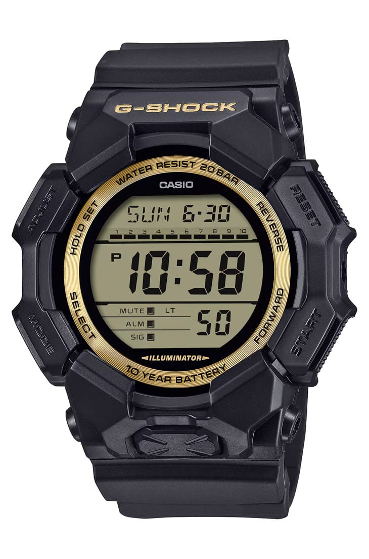 如果你正在物色第一只G-SHOCK,GD-010GB-1A9會是非常穩妥的起點,《Watch LIFE NEWS》對GD-010系列的評價相當高,認為它擁有「超越定價」的實用度與外型完成度,錶款的黑金配色策略鮮明:全黑錶身負責態度,金色蒸鍍與鏡面點綴則負責亮點,兩者相互平衡後,形成一種強悍中帶點華麗的街頭感。功能性方面,它具備10年電池續航力,對入門玩家來說省心省力;前置大按鈕啟動的高亮度LED燈在夜間判讀極為實用,想找一款價格親民、風格明確,平時戴著也不怕碰撞的小鋼炮?GD-010GB-1A9幾乎沒有挑戰者。