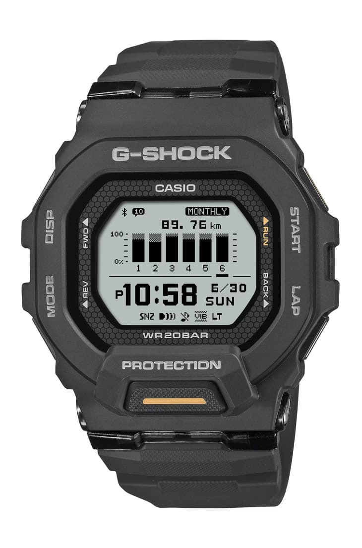 GBD-200-1A1在運動錶定位中很有記憶點,它保留G-SHOCK經典的方殼,但整體卻做成G-SQUAD系列歷來最薄的造型,對跑者而言,這代表手腕更靈活、袖口不卡、日常佩戴更接近「忘記它存在」的舒適度。功能是這款錶的另一個賣點。透過藍牙連結手機,手錶的加速度計數據能與手機GPS進行修正,讓配速與距離更準確,包含卡路里、計步、間隔定時器等訓練項目也都一應俱全,非常適合以手機輔助紀錄的日常跑者;此外,樹脂錶帶增加了更多調整孔,使透氣與貼合度顯著提升,若你想擁有專業度與輕量感兼具的訓練工具,GBD-200-1A1是明確的答案。