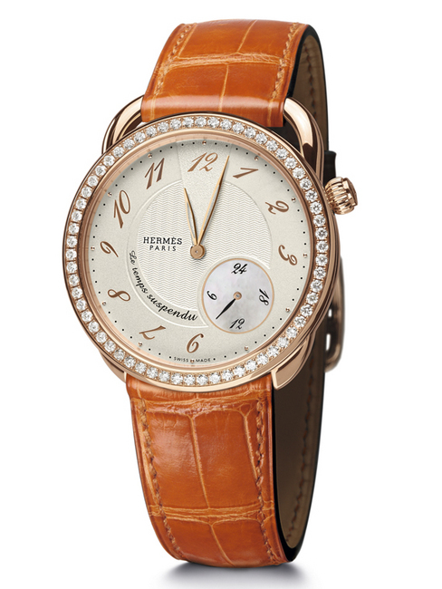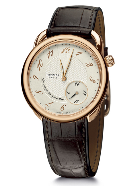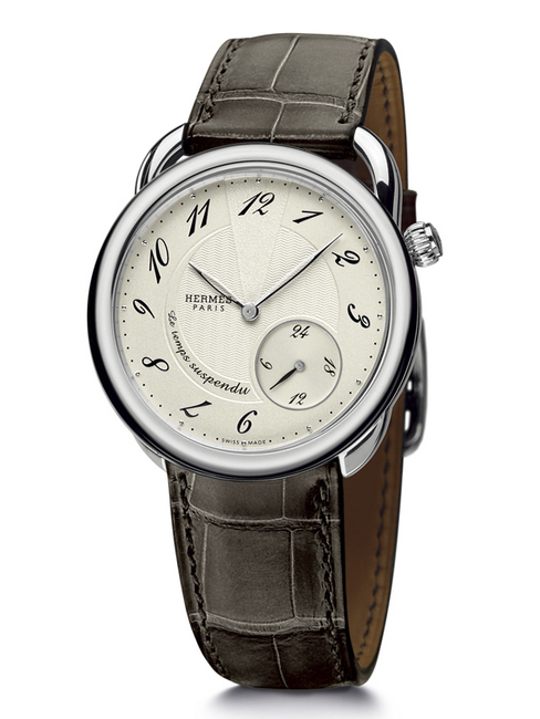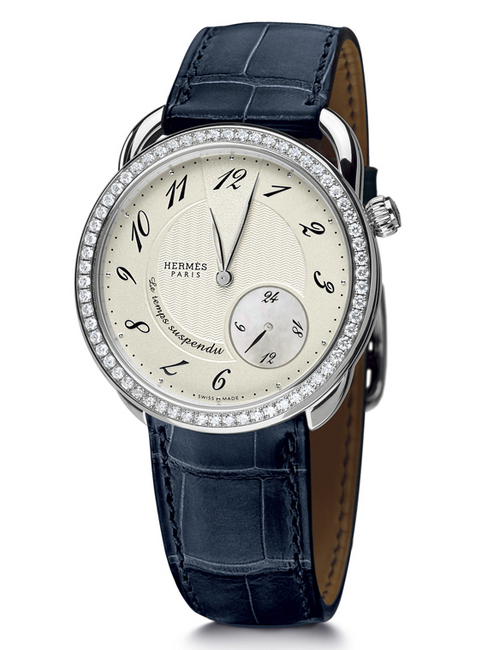 Arceau Le Temps Suspendu手錶在時間不受支配的前提下,帶來一個體驗休止、間歇的機會。直徑38毫米錶殼上的按鈕,甫按下,時分針於12時瞬間止步。時間就這樣從錶盤抹掉,與標準時間脫軌,同時間地隱形前行。再次按下按鈕,時間重回正軌,運作如常。目光即時被鎖定在24秒刻度小錶盤上,生動的指針無休地以逆時針方向運行,以獨樹一格的方式嘲弄時間的流逝。