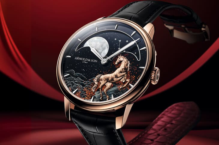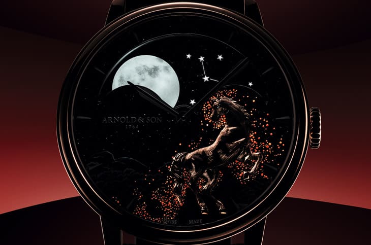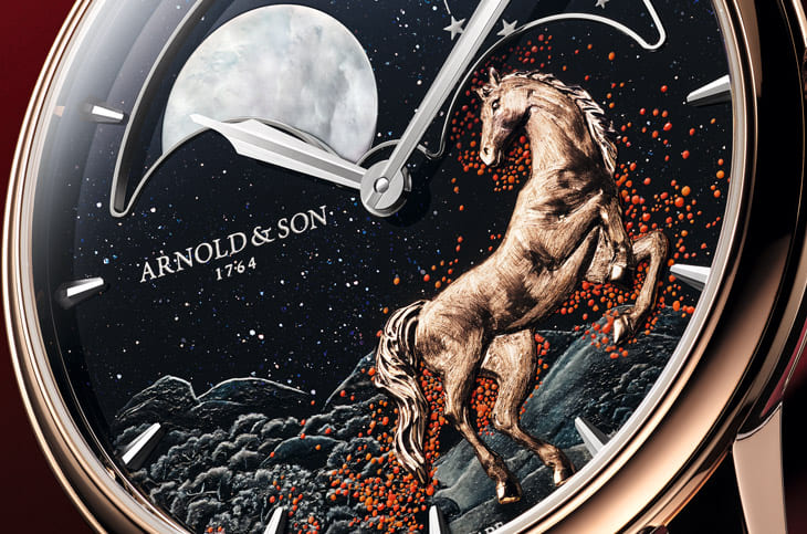 ARNOLD & SON最新釋出的這款Perpetual Moon 41.5 Red Gold « Year of the Horse »是讓人眼睛為之一亮的「超前部署」之作,為了迎接2026丙午火馬年,亞諾錶將積累了6年的生肖錶製作功力,一次熾烈爆發而成一款藝術畫風格逸品。