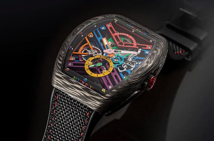 ▲FRANCK MULLER Vanguard Skeleton Color Dreams採碳纖維錶殼與七日鍊鏤空機芯,彩色時標呈現活潑又穩重氣質。