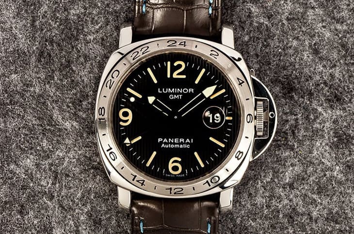 隨著品牌知名度提升與客群國際化,沛納海也逐漸回應實際佩戴需求,1999年推出的Luminor GMT PAM00029,便是將兩地時間功能納入設計的重要一步,GMT指針被低調地安置在面盤中央,原本留白的錶圈則轉化為實用24小時刻度,讓整體視覺依舊乾淨,卻多了明確用途。這種改動並未破壞既有比例,反而展現沛納海在「加法設計」上的自制能力,證明功能可以融入,而不是額外堆疊。