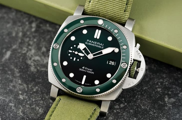 2025年Submersible PAM01287則呈現出沛納海當前的狀態,44mm錶殼以e-Steel再生鋼合金打造,延續品牌對材質科學的高度投入,同時回應永續議題。搭配綠、藍、黑等色調,這只錶坦然靠攏現代手錶設計同時肩負機械與風格角色。從BMG、Ti-Ceramitech到Ceramica,沛納海的材質實驗室持續擴張,但每一次嘗試,仍然回到「是否符合這只錶該做的事」這個核心問題。