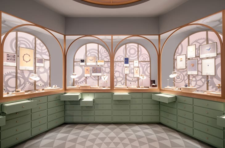 展覽的最後一區「訴說時間的珠寶」,則回歸梵克雅寶的高級珠寶根源,展出Ludo系列及Sweet Alhambra腕錶,透過機刻雕花與貴金屬結合寶石,將時間轉化為視覺饗宴,觀眾能近距離欣賞瑞士製錶師、琺瑯師與寶石鑲嵌師的現場示範,揭開頂級工藝的神祕面紗。