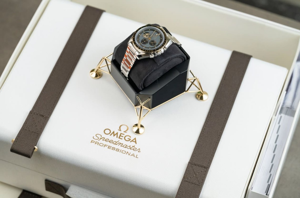 談到善用包裝說故事,歐米茄絕對是代表性案例。超霸系列的登月錶,幾乎已把錶盒變成敘事道具,模擬太空衣布料的外觀、附加的錶帶與扣環,都在強化「太空任務裝備」的角色設定,某些版本甚至加入放大鏡與鋼製紙鎮,巧妙呼應太空飛行的情境;阿波羅11號50週年紀念款更直接把登月艙變成錶座,這些設計未必人人需要,但對收藏家來說,卻大幅加深了情感連結,也讓人更願意完整保存盒單。