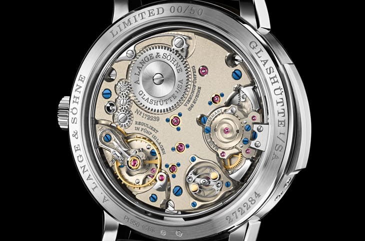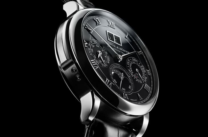 L122.2機芯是朗格近年最具代表性的工程成果之一,由640枚零件組成,整合三問報時與萬年曆,卻仍保有72小時動力儲存,這本身就已經說明朗格在能量管理上的深厚功力。從背面欣賞,所有朗格經典元素一應俱全,像是德國銀3/4夾板、手工雕刻擺輪夾板、藍鋼螺絲,以及經過極致黑色拋光的音錘;特別是音錘的鏡面效果,只在特定角度反射光線,其餘時間深黑如墨,這是頂級手工打磨的象徵。但真正讓這枚機芯與眾不同的,是它的實用思維,朗格為這只三問錶罕見地加入20米防水性能,解決了滑桿結構與密封之間的衝突,讓佩戴者不必對濕氣過度焦慮,萬年曆調校可以靠錶殼側面的隱藏式按把完成,使用直覺,錯誤風險低。種種設計都指向同一件事:朗格不是做一只僅能靜態收藏的複雜錶,而是一只真正可以陪伴生活的頂級時計。