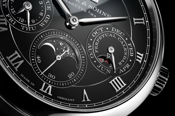 萬年曆最怕什麼?不是複雜,而是亂,資訊一多,面盤一滿,再好的功能都會變成視覺負擔,錶款的黑色面盤並非單一零件,而是由四個獨立部件組合而成:基底為實心18K金,經多次高溫燒製與手工拋磨,才得到這種深邃、均勻、幾乎沒有反光雜訊的黑色琺瑯成果,這讓白金時標、鍍銠指針與大日期視窗,在任何光線下都能清楚易讀。朗格同時運用細緻的白金立柱線條,作為視覺分區的邊界,6點鐘位置的小秒盤裡,藏著整只錶最浪漫的細節:月相顯示,月亮由實心金材製作,周圍超過百顆星星全為手工雕刻,每一顆都有不同深淺與角度,這是只有放大鏡下才會真正感動人的細節,也正是朗格最迷人的堅持。