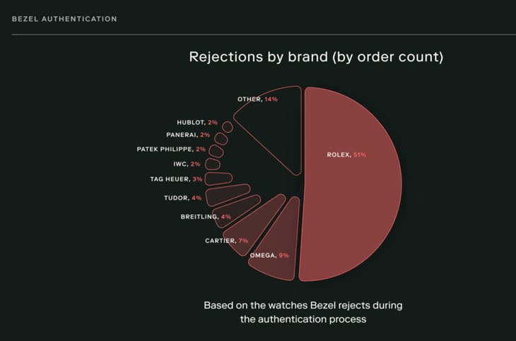 ▲2025年勞力士成為Bezel拒收重災區,假貨與拼裝錶問題頻傳,占整體拒收量高達51%。Source:Bezel