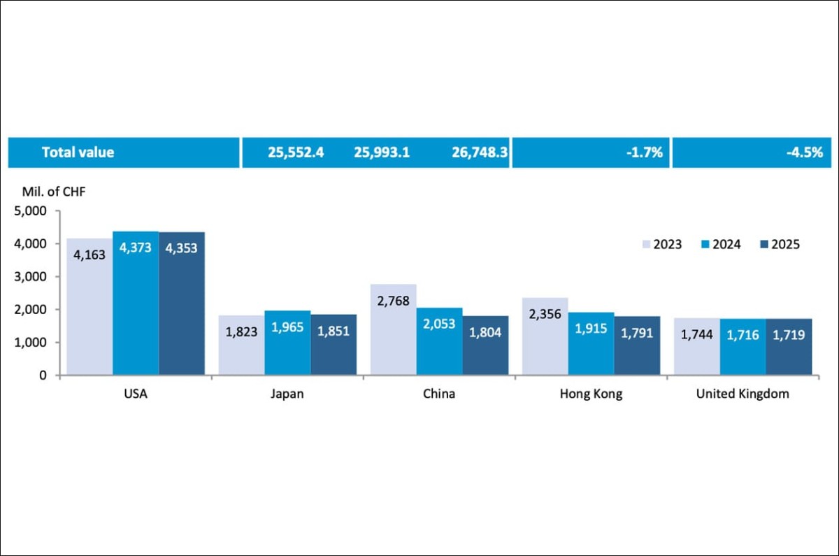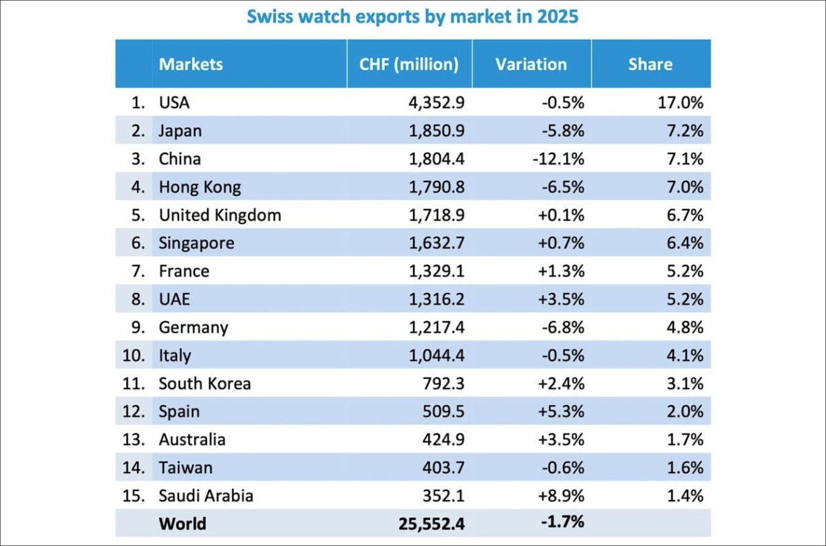 美國仍然是瑞士手錶出口的頭號市場,全年出口額微幅下跌0.5%,收在約43.5億瑞郎,但這個看似平穩的數字背後,其實經歷了極端波動。2025年間,美國對瑞士手錶進口關稅一度升至39%,促使品牌提前囤貨,而稅率高漲期間出貨則大幅放緩,到該年年底,關稅回調至15%,直接引爆12月出口額暴增19.2%。這一波「衝刺式」出貨,不僅挽救了全年數據,也突顯了政策波動對市場的直接影響,對瑞士鐘錶品牌而言,美國市場的動態已成為全年業績的關鍵變數。