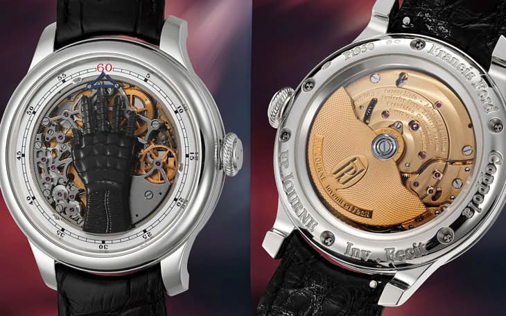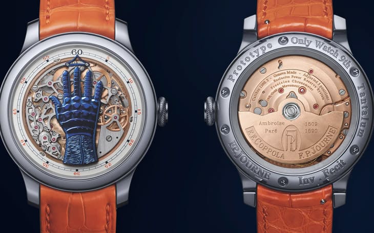 位居目前F.P. JOURNE拍賣紀錄榜首的是FFC Prototype "Francis Ford Coppola"原型錶,甫於2025年12月在紐約富藝斯(Phillips)拍賣會以驚人的1,080萬美金(約合台幣3億3,940萬)落槌,一舉刷新品牌拍賣史最高紀錄。手錶的靈感源自導演柯波拉的構想:用手指的動作來顯示時間,經過7年的研發,Journe成功打造出五根手指伸縮指示小時的機械裝置,其設計靈感追溯至16世紀外科醫生Ambroise Paré的義肢,這只原型錶是全球唯三由Journe親手組裝的作品之一,黑色鈦金屬手指搭配白色分鐘刻度環,以及錶背鐫刻的"FFC Coppola"字樣,使其工藝與藝術價值兼具。