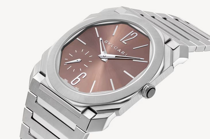 ▲Octo Finissimo 103856以八角錶殼與鮭魚粉面盤為亮點,搭載超薄自動機芯,設計與工藝兼具。