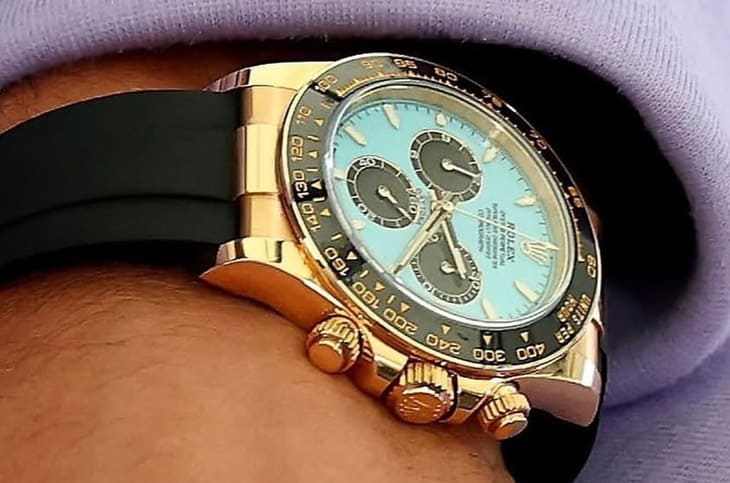 ▲黃金錶殼搭配黑色橡膠錶帶,綠松石藍面盤鮮明搶眼,完美呼應Alcaraz的年輕節奏。Source:Instagram @ifuckinglovewatches