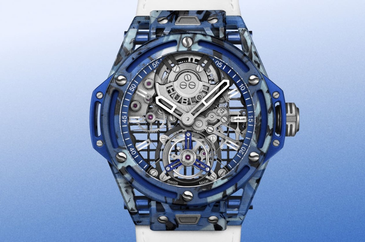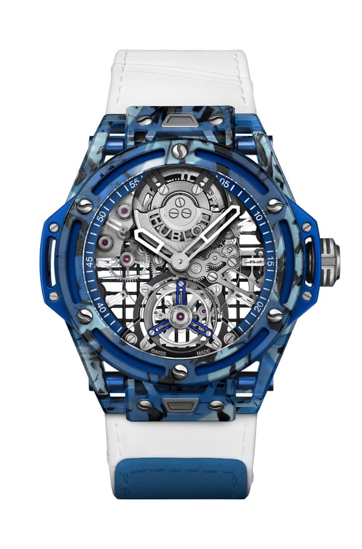 Novak Djokovic實際使用過的球衣與球拍纖維所製成的複合材質/HUB6035自動上鍊機芯/時、分顯示/陀飛輪裝置/藍寶石水晶鏡面、透明底蓋/防水30米/錶徑44mm/限量72只/參考價:NT$ 3,566,000