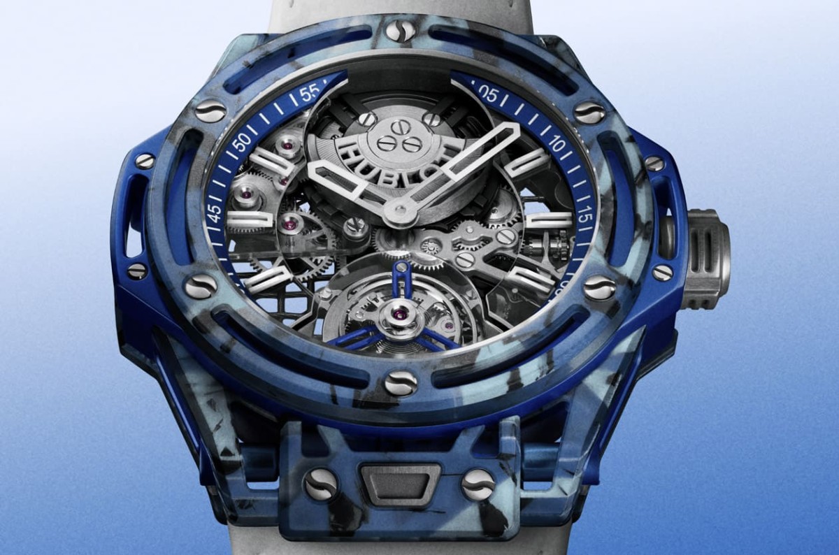 錶殼材質,是整只錶最有故事性的地方,宇舶直接取用喬科維奇在2023賽季實際穿過的Lacoste藍色Polo衫,以及他使用過的 HEAD網球拍,將這些織物與碳纖維、石英粉末一同封入樹脂之中,打造出獨一無二的藍色複合材質,成品呈現出宛如大理石迷彩般的紋理,每一只都不相同,就像每一場硬地決賽都無法複製。