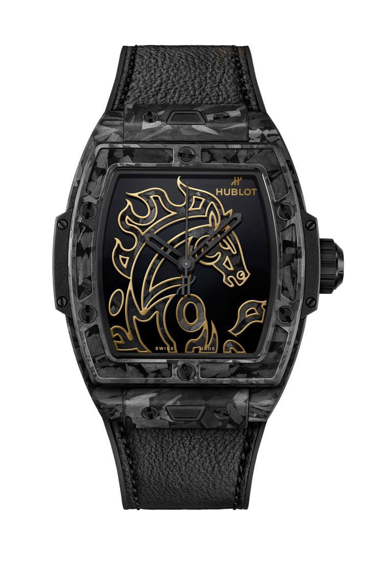 碳纖維材質/HUB1710自動上鍊機芯/時、分、秒顯示/鑲貼霧面碳纖維駿馬圖案面盤/藍寶石水晶鏡面、透明底蓋/防水100米/錶徑42mm/限量88只/參考價:NT$ 1,177,000