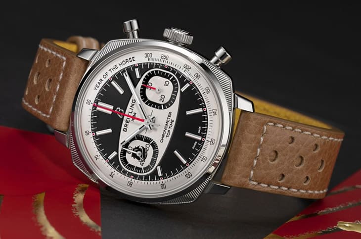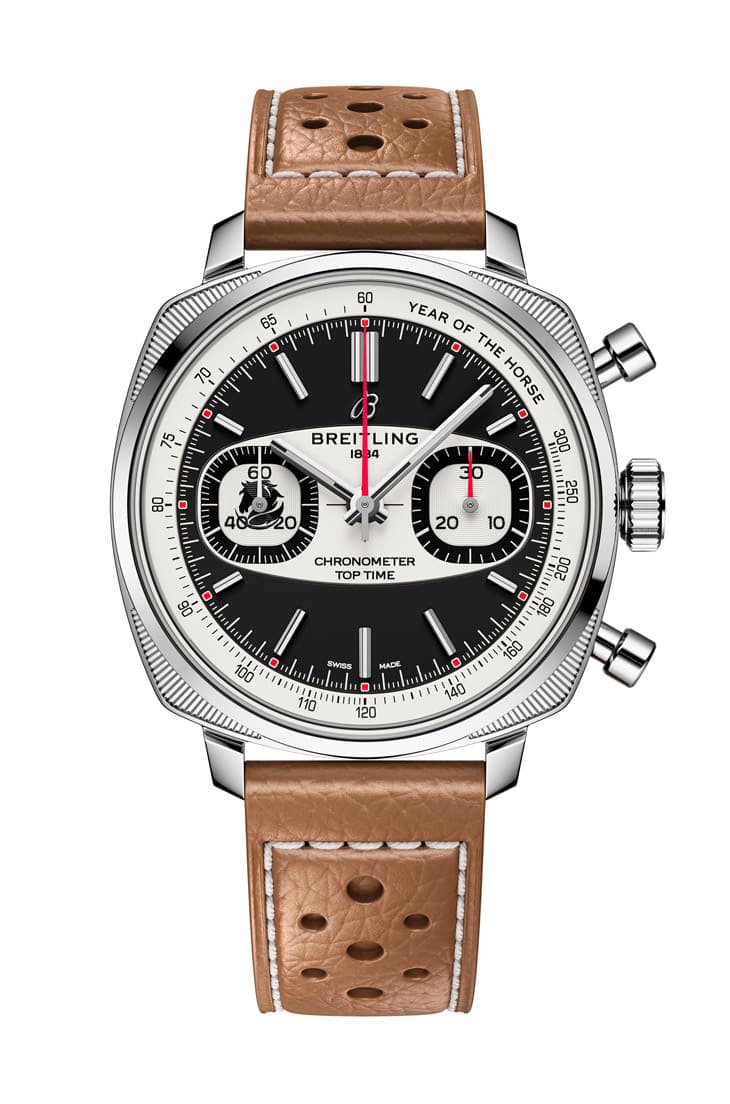 接著將鏡頭轉向賽道,百年靈選擇以速度詮釋馬年,推出了Top Time B01 Shadow Rider夜影黑駒限量版,品牌深知馬與「馬力」之間的連結,因此並未採用傳統的東方繪畫風格,而是將象徵自由的黑馬剪影置於9點鐘的小秒盤上,與復古的黑白「反熊貓」面盤形成強烈對比,面盤上的紅色計時指針與測速圈上的"YEAR OF THE HORSE"字樣,在冷靜的賽車風格中點燃了節慶的熱度,翻至錶背,實底蓋上同樣鐫刻著黑駒側影,這是一款真正將生肖文化轉化為賽道精神的帥氣之作。