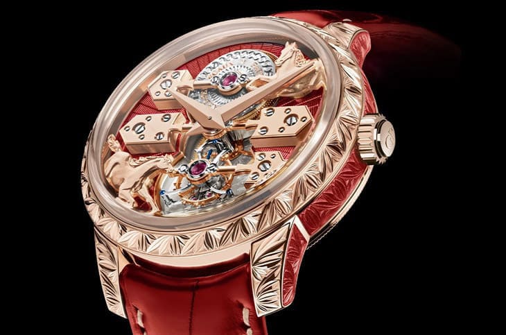 18K玫瑰金材質/A&S1512手動上鍊機芯/時、分顯示/月相顯示/黑色砂金石面盤鑲嵌手工雕刻駿馬金雕/藍寶石水晶鏡面、透明底蓋/防水30米/錶徑41.5mm/限量8只/參考價:NT$ 2,450,000