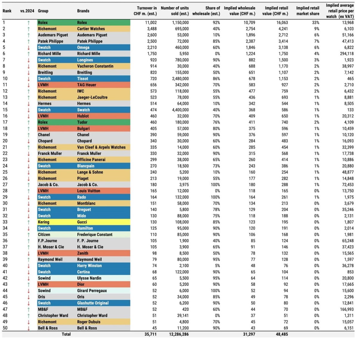 ▲2025年瑞士鐘錶產業「集團」市佔率圓餅圖。Source:LuxeConsult, Morgan Stanley