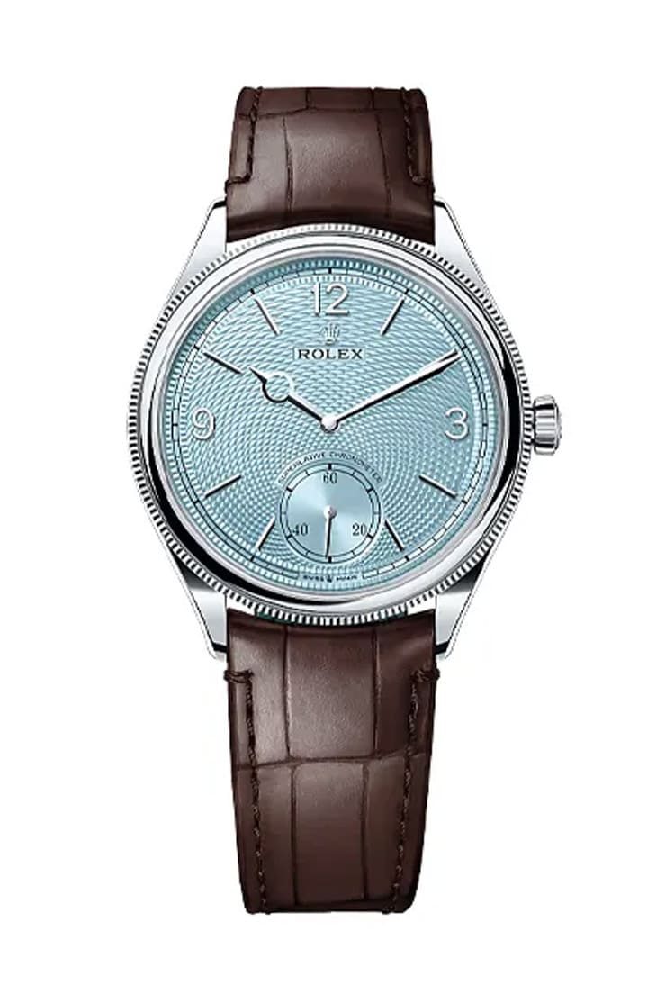 壓軸介紹的是ROLEX 1908鉑金款,39mm錶徑、冰藍色立體穀粒紋面盤,搭配棕色皮帶,優雅得近乎低調,他直呼「愛死了」,語氣像個剛入手新玩具的男孩,而不是奧斯卡影帝。