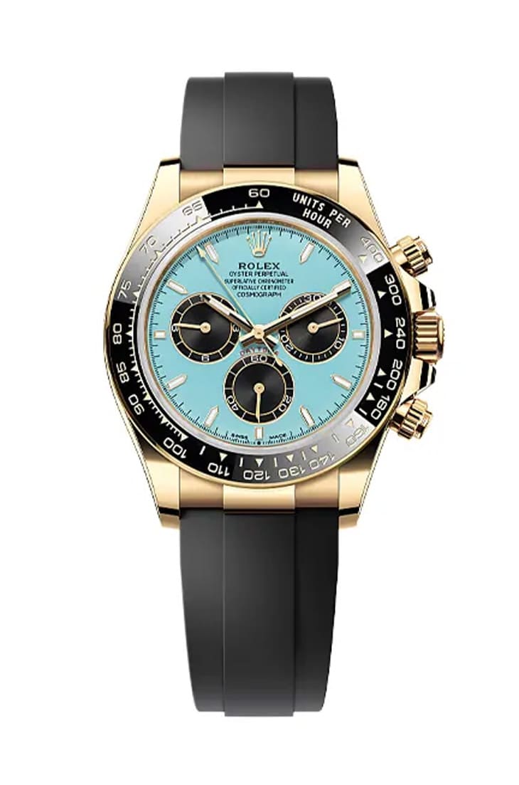 談到溫布頓,他突然亮出ROLEX Cosmograph Daytona,黃金錶殼搭配黑色Oysterflex橡膠帶,再加上近似「TIFFANY藍」的綠松石色面盤,張揚卻不俗氣,他說自己最愛穿西裝時佩戴這只,袖口間若隱若現的那抹藍,足以讓全場目光聚焦。