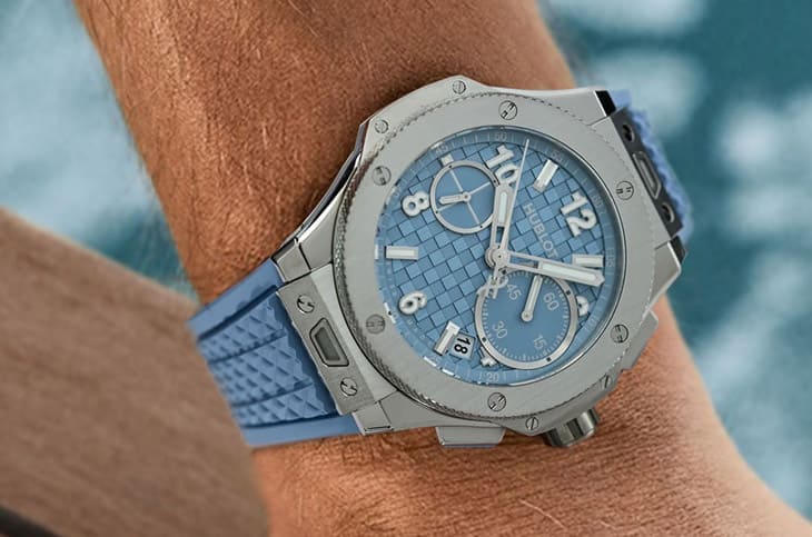 有趣的是,這樣柔和、偏粉彩的灰藍色,卻被放進Big Bang系列極具侵略性的幾何輪廓中,這種「剛與柔」的反差,反而讓整體設計更耐看,也更貼近當代審美,雖不張揚,但有態度。
