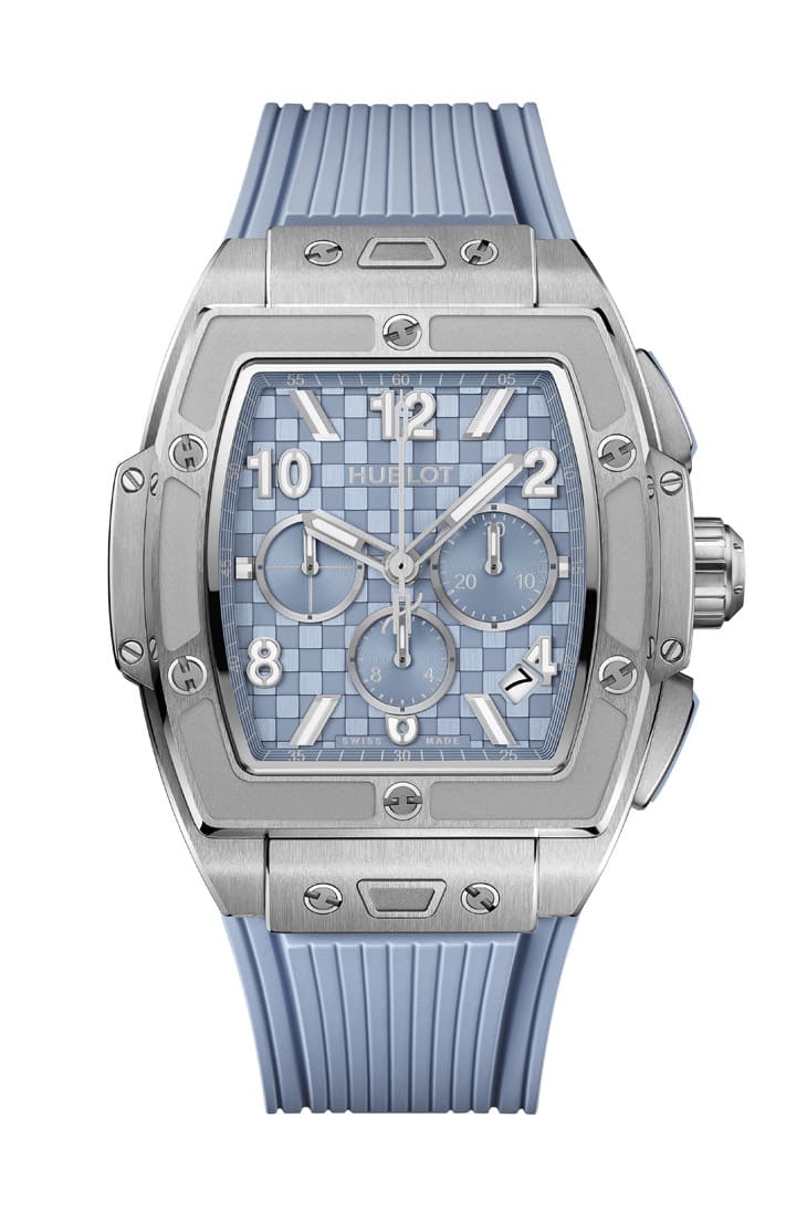 另一款Spirit of Big Bang潮蒼藍鈦金計時碼錶,則將同樣的色彩帶入酒桶型錶殼,42mm尺寸搭配六顆H形螺絲,辨識度極高,其內部搭載HUB4700機芯,源自真力時El Primero架構,具備5Hz高震頻,強調計時精準度。這兩款男錶的共通點,在於將理性結構、運動性能與時尚語彙整合成一種「新正裝」風格——不再拘泥傳統,但依然講究。