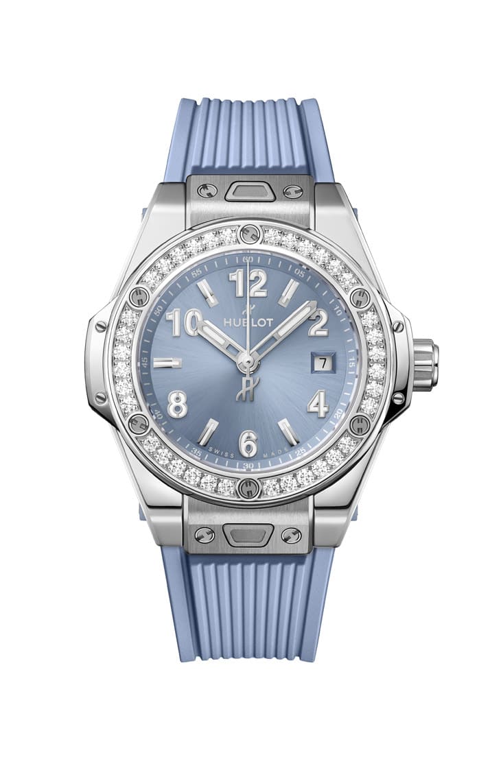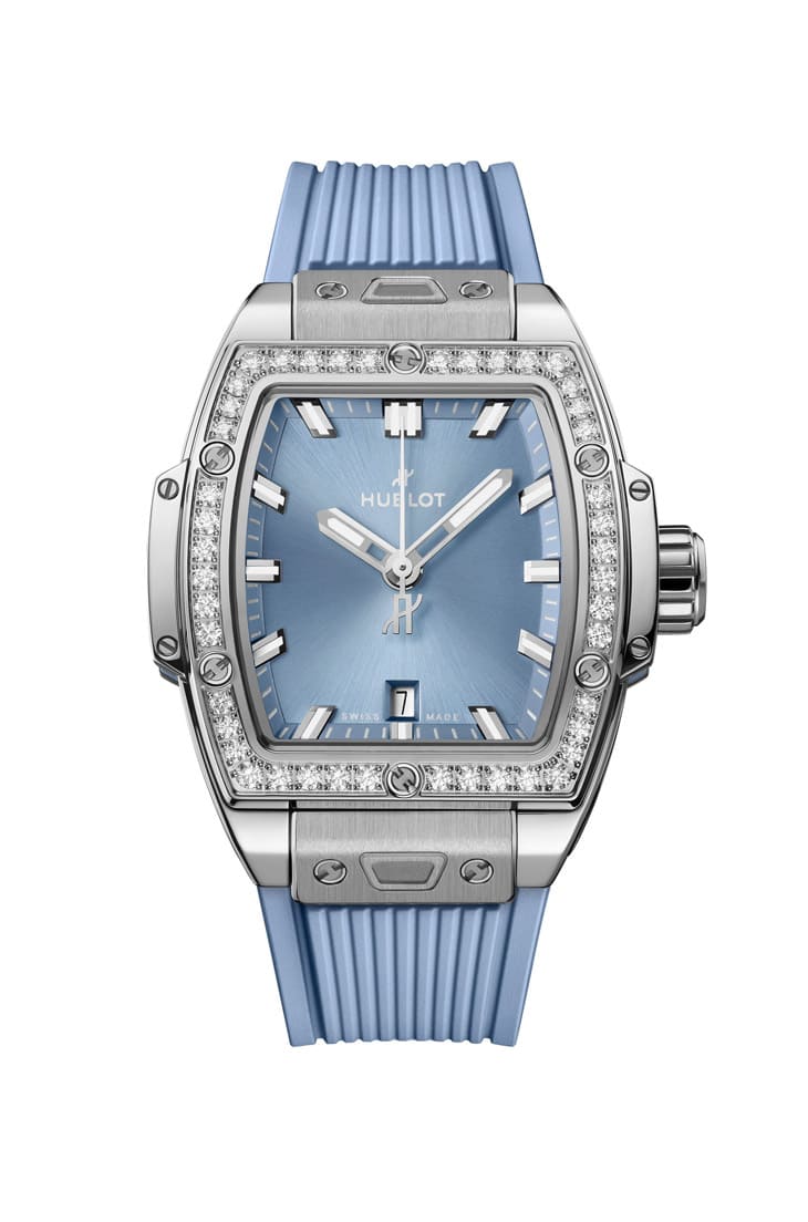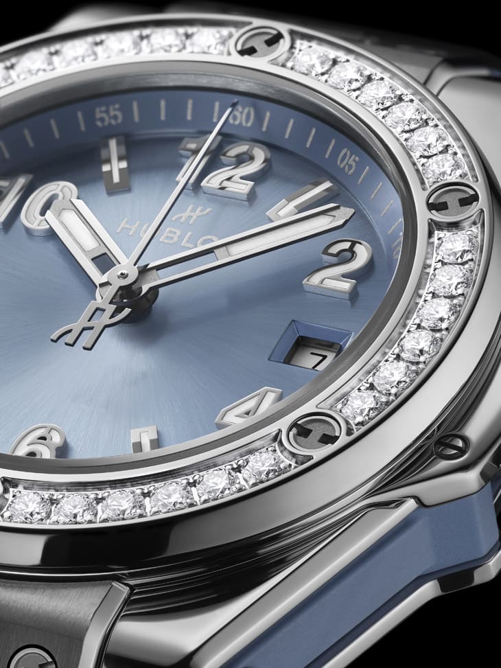 相較男錶的結構張力,女款則轉向另一種語言——內斂與光澤。Big Bang One Click與Spirit of Big Bang兩款鑲鑽手錶,尺寸分別為33與32mm,更貼近女性日常佩戴需求,面盤捨棄立體碳纖維紋理,改用緞面太陽紋設計,光線由中心向外擴散,呈現細緻的銀藍色光影變化。錶殼的灰階不鏽鋼與潮蒼藍形成自然過渡,使整體視覺更柔和,再加上鑲嵌鑽石的錶圈,分別鑲上36顆或44顆不等,在低調基調中加入一點精緻亮點,剛好呼應近年流行的Quiet Luxury。