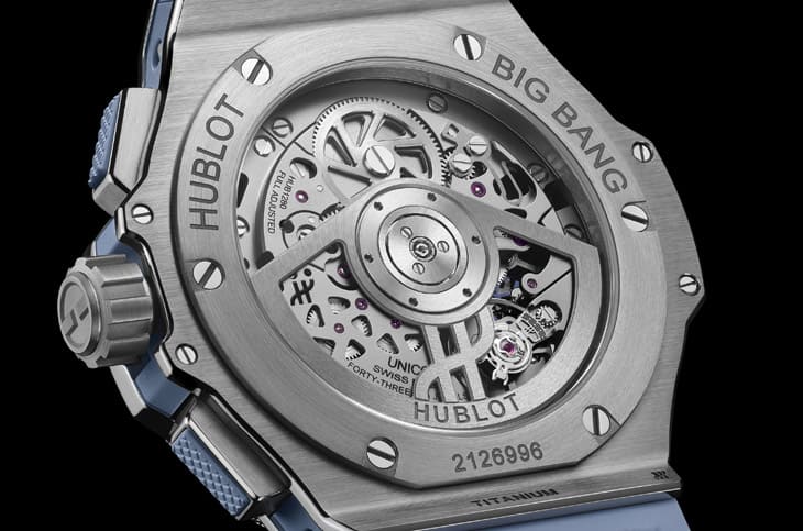 鈦金屬材質/HUB1280自動上鍊機芯/時、分、小秒、日期顯示/計時碼錶功能/藍寶石水晶鏡面、透明底蓋/防水100米/錶徑43mm/參考價:NT$ 603,000