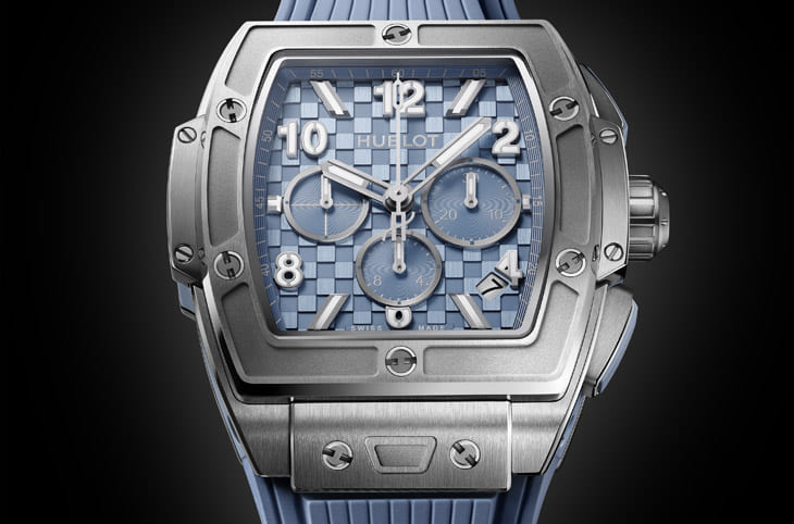 本次系列中,兩款男士計時碼錶最能體現宇舶的核心精神,首先是Big Bang Original Unico潮蒼藍鈦金計時碼錶,43mm鈦金屬錶殼透過拋光與緞面交錯處理,讓光影在不同角度產生層次變化,搭配藍色立體橡膠錶帶與One-Click快拆系統,實用性與風格兼具。面盤部分不走傳統平面設計,而是採用類碳纖維紋理的立體浮雕結構,透過幾何排列的緞面與拋光區塊,營造出強烈的3D視覺效果,這種設計其實很「建築」,也正好呼應近年寬鬆剪裁西裝的輪廓趨勢,看似隨性,但細節充滿控制力。錶款機芯為HUB1280 UNICO飛返計時機芯,具備導柱輪結構與72小時動力儲存,透過藍寶石底蓋可一覽無遺。