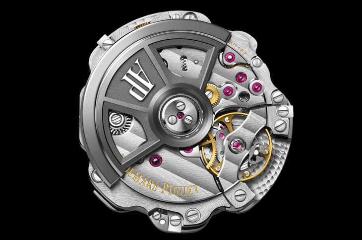潛水錶做透明底蓋,一直是個技術與哲學的雙重挑戰,多數品牌會選擇保守路線,用實底蓋確保防水,但愛彼選擇「我全都要」,這只錶搭載的4308自動機芯,維持300米防水的同時,還能透過藍寶石底蓋完整展示,這點本身就很有說服力。機芯規格也很紮實:4Hz震頻、約60小時動力儲存,穩定性與日常實用性都沒問題,結構由234枚零件組成,配置32顆紅寶石,屬於現代高階自動機芯的標準配置。但真正讓人停下來看的,是它的修飾,日內瓦波紋、珍珠圓點打磨這些基本功都有,而且做得很細緻,最吸睛的是那枚22K金自動盤,經過黑化處理後,呈現出低調但深沉的光澤,這種設計很有意思,外觀是鮮豔、張揚的運動風格,翻到背面卻是冷靜、細膩的機械工藝。兩種性格同時存在,這正是愛彼厲害的地方。