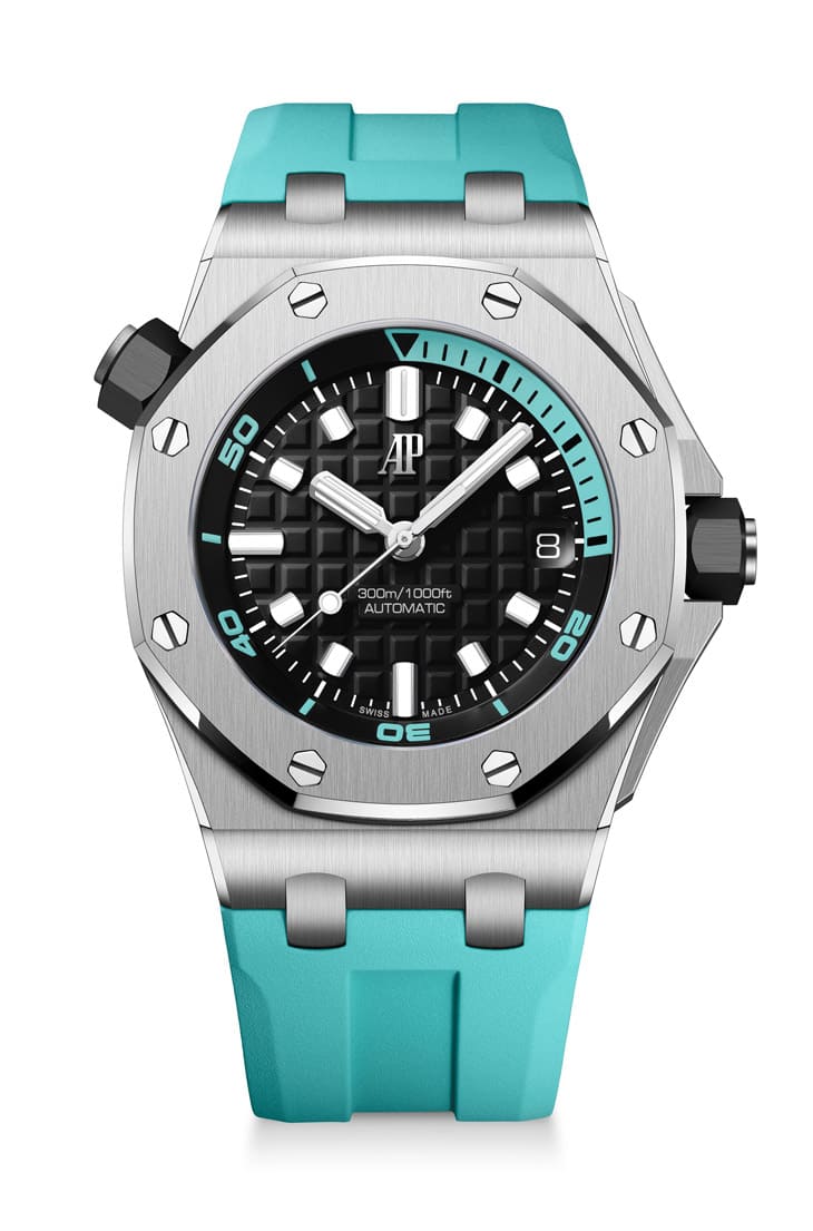 ▲愛彼以黑色面盤為主軸,搭配青綠色刻度與同色錶帶,另有白色結合白金細節,呈現鮮明對比與夏日活力風格。