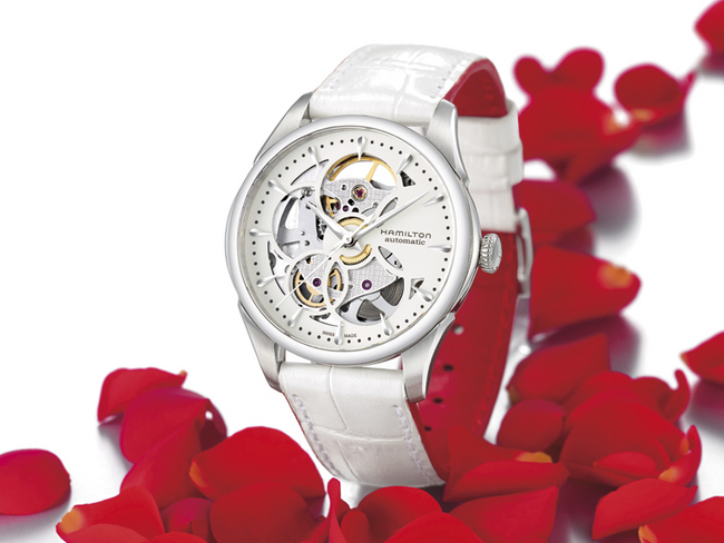 HAMILTON Jazzmaster Viewmatic Skeleton女裝手錶果敢開放,沒有半點隱藏,造型充滿浪漫魅力,裝飾細節一絲不苟。圓形閃亮白色錶面利用新穎的現代花絲工藝造出不同形狀的小窗,拼湊花卉般的圖案,修長的時標宛如凝定露珠。錶面設計可觀看獨有的H-20-S自動機芯,內裡的寶石紅花瓣元件舞出美麗韻律。手錶的底蓋也在上演「後台」好戲,透視設計讓機芯一覽無遺。現代女性早已習慣多重功能的生活方式,HAMILTON Jazzmaster Viewmatic Skeleton當然迎合她們的需要,構思了獨特新穎的易扣式錶帶,女士們隨時可將五排不銹鋼錶帶換上白色皮革錶帶,皮錶帶還綑飾絢麗的寶石紅邊,方便配襯不同服飾、場合或造型。