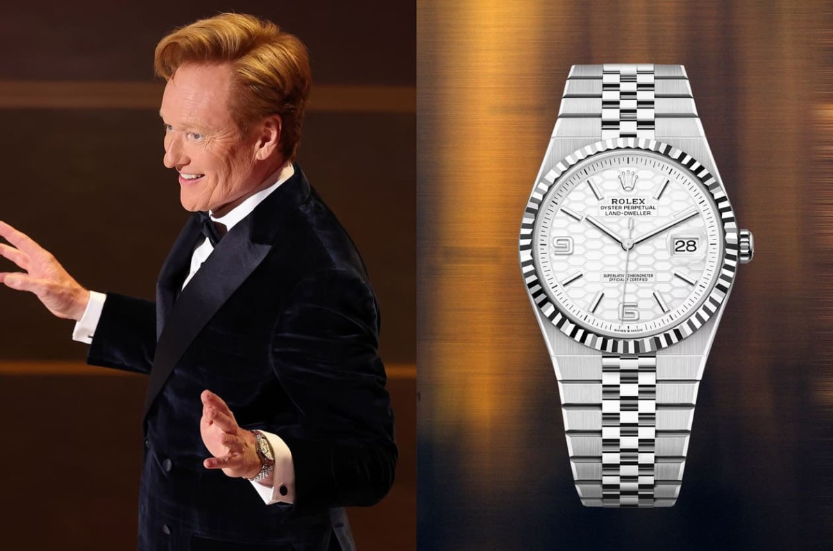 ▲主持人Conan O’Brien本次罕見捨棄OMEGA,改戴勞力士金鋼Land-Dweller登場。Source:Teddy Baldassarre
