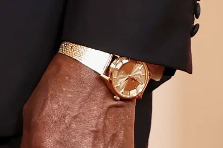 即使缺乏完整資訊,但從現場捕捉到的影像細節,仍然可以拼湊出不少關鍵線索,Delroy Lindo戴的那只手錶明顯採用全金屬結構,搭配線條收窄的米蘭網狀鍊帶,整體氣質偏向復古優雅,更重要的是,其面盤中央微微隆起、邊緣向下傾斜的結構,幾乎可以確定是經典的「八卦面」設計,而銳利的立體時標與太子妃指針,更進一步強化了這種中世紀正裝錶的視覺特徵。