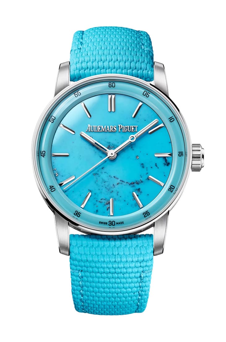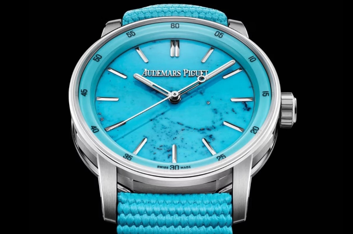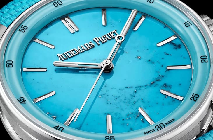 這款作品最吸睛之處在於綠松石面盤,綠松石自古以來被視為幸運護身寶石,愛彼工匠以極致細膩的手法切割打磨天然石材,保留其深邃色澤與獨特脈紋(Matrix紋路),每一只都是獨一無二的藝術作品,天然紋理賦予手錶自然戲劇感,搭配38mm的白金錶殼,冷暖色調的視覺效果充滿現代感,錶殼表面交錯施以霧面拉絲與拋光處理,雙曲面防眩光藍寶石鏡面與底蓋兼具美觀與30米防水性能。