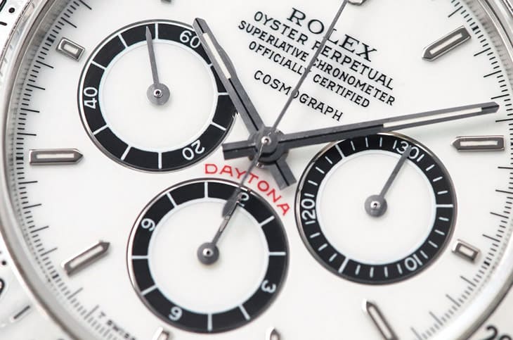對於熟悉鐘錶歷史的玩家而言,辨識ZENITH Daytona其實是一件相當直覺的事,最關鍵的線索來自面盤配置:小秒針固定於9點鐘位置,3點鐘為30分鐘計時盤,6點鐘則是12小時計時盤,這種佈局與後來自製機芯時代的設計形成鮮明對比,也成為最簡單直接的辨識方式。然而,在長達12年的生產期間,這一世代其實衍生出許多細節差異,例如早期出現的「倒置6」設計,或是字樣從四行變為五行的排版調整,甚至還有"Floating Cosmograph"這類因字距不同而產生的視覺變體,這些微小差異在今日收藏市場中往往被放大解讀,成為價值判斷的重要依據。