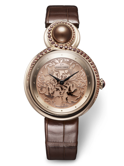 錶圈上一條鑽帶綿延環繞,突顯出手錶的玲瓏曲線,呈現出簡約精緻之美。錶冠的延伸效果令錶殼更顯圓潤飽滿,而弧形藍寶石水晶鏡面、錶盤及指針則進一步展現此款時計的立體效果。錶盤上細緻鐫刻了雀鳥於林中自由飛翔的嬉戲之景,大自然的活力頃刻間躍然而出。生機勃勃的場景中每一細微之處都極盡詮釋雅克德羅對新的一年的美好祝福與希望。