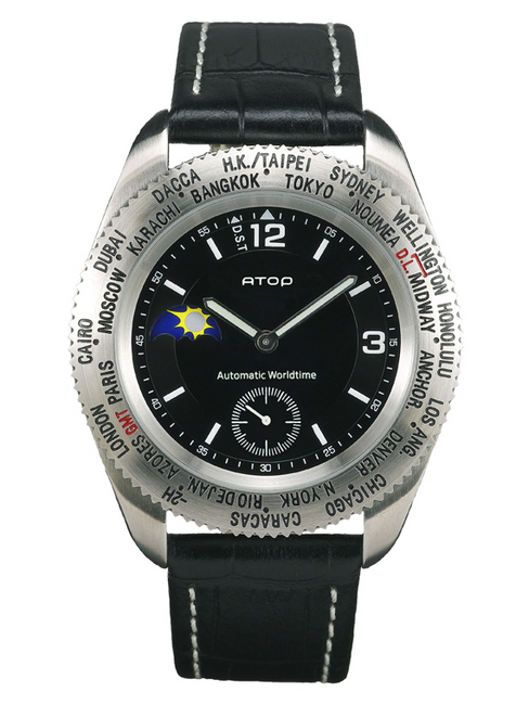 ATOP世界時區手錶最大的特色在於易於讀取世界各地時間,只要撥動的轉盤,時針與日夜顯示裝置會同步轉動,白天或晚上一目了然,同時秒針仍持續擺動,不影響時間準確性。D.S.T日光節約時間功能,只要旋轉城市盤,將預知之城市對準D.S.T(11點半位置),即可得知歐美地區之夏令時間(每年3月~10月)。ATOP創新的「世界時區機芯」已獲台灣、中國大陸、香港、美國專利。沉穩內斂的外型,無論是商務、出國、旅遊等使用方便,造型更加出色。