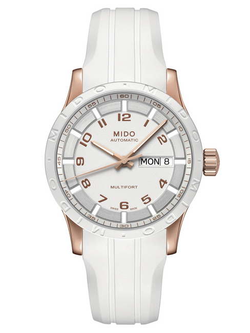 板橋大遠百生日慶特別推薦2014年 Multifort先鋒系列最亮眼新品Multifort Lady White先鋒系列純白運動手錶,系列以澳洲雪梨港灣大橋(Harbour Bridge Sydney)為靈感來源,Multifort先鋒系列手錶保有一貫的運動風格精髓,春夏新品錶款以白色為基底,搭配最浪漫的金屬色玫瑰金,呈現都會男女的自信優雅。42mm大錶盤以立體橡膠錶圈與盤面上豐富的結構層次,增添濃郁的運動氣息,銀色PVD處理髮絲紋金屬輪圈主導視覺,劃分12時刻,錯落有致的錶圈方格反映出設計靈感鮮明的橋樑結構,霧面質感的橡膠錶圈以立體設計為錶款增添動感曲線,低調鐫刻品牌MIDO字樣,低調描繪輕盈律動感。錶款採旋入式錶冠,擁有雙面防眩藍寶石水晶玻璃鏡面,防水可達100米,輔以醒目白色夜光Super-LumiNova時刻線條與指針,在黑暗中仍可清楚閱讀時間,建議售價NT$34,800。