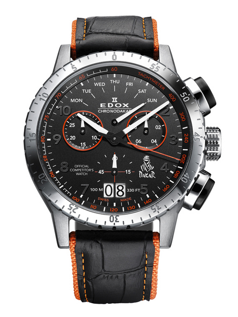 EDOX Chronodakar 2014限量版,全球僅限量生產 500 只。全新的錶款提供最先進的功能,如測速儀,計時功能和超大日期顯示。這款新的越野挑戰者具有豐富的車迷的特性: 裝載著瑞士計時機芯與日期逆轉功能,超大氣的47MM 直徑,超輕鈦金屬以及最精巧的是仿賽車引擎啟動按把的「開始」和「停止」按鈕。黑色及橘色的標識凸顯出這款時尚和堅固耐用,承受著極度惡劣的沙漠氣候,這款全新的 Chronodakar 限量錶對賽車手及車迷而言,無疑是一款完美的手錶。