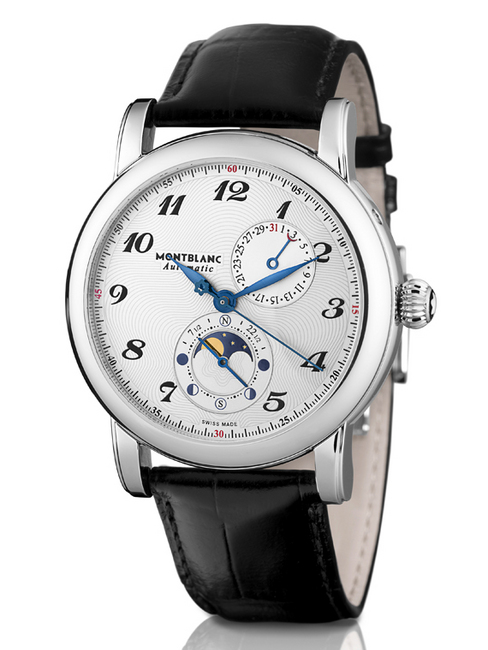 此款手錶面盤飾以扭索紋飾 – 高級鐘錶設計的經典元素,這也是萬寶龍Star系列手錶最具象徵性的獨特放射狀六角星紋飾面盤,後來演化成雙月相小錶盤上的類萬寶龍標誌輪廓。扭索紋飾一直延伸至錶盤最外圈的走時刻度,在一點鐘和兩點鐘之間有一個非對稱排列的指針式日期小視窗,在十點鐘的位置印有長方形排列的「Montblanc」以及「Automatic」字樣,意指本錶款使用的是自動上鏈機械機芯。創新的日期顯示排列、15、30、45、60分鐘與31日的刻度採紅色亮點顯示以及日期指針頂端上的紅色月牙,皆是本錶款極為獨特之處。萬寶龍Star系列特有的黑色阿拉伯數字與銀灰色的背景呈現鮮明的對比,藍鋼指針也與背景色呈現強烈對比,方便配戴者讀取時間:包括柳葉形時針與分針、棒形秒針(另一端為用來平衡的萬寶龍標誌)、細長筆直的月相月齡指針以及細長的日期指針(頂端有一亮紅色的月牙)。