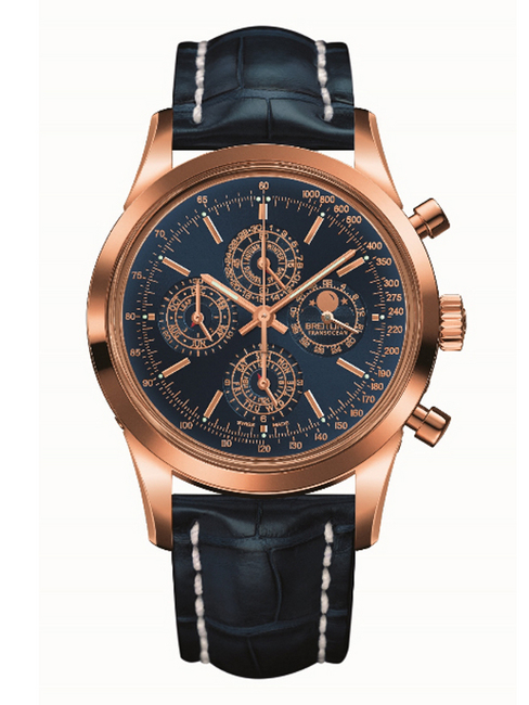 機芯精密運轉的 Chronograph QP計時手錶擁有精密複雜的萬年曆系統,能自動計算每個月份的不同天數以及閏年才出現的2月29日,更可連續精準地顯示日期、星期、周數、月份、季節、閏年週期以及月相,配備計時功能,以BREITLING承襲半個多世紀的越洋精神,全新演釋時光和旅行的非凡魅力。錶殼採用18K紅金材料,搭配獨特的深藍色鱷魚皮錶帶,與午夜藍色的錶盤相互映襯,硬朗之下更添奢華神秘之感。