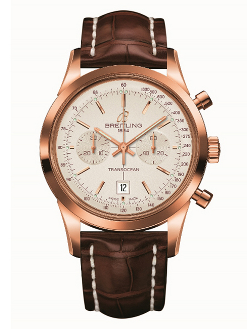 以簡約華麗的風格再次詮釋經典設計的Transocean Chronograph 38計時手錶兼具獨特風格與優雅氣質,精緻的38毫米錶面完美貼合女士的纖細手腕,銀白色錶盤上壓嵌立體時標,並飾以「蝸紋」的凹嵌式計時器,雙累積計時器對稱設計和諧雅致。18K紅金錶殼及復古的18K金「B」字標誌,搭配金色鱷魚皮錶帶及經瑞士官方天文台認證(COSC)的自動上鏈計時機芯,精密非凡,盡顯尊貴。
