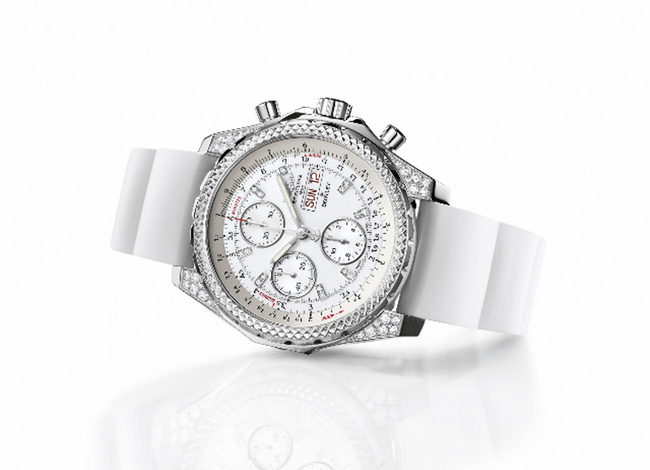 BREITLING for BENTLEY GT純冰計時手錶鑲鑽版採用BENTLEY汽車獨有的純冰色彩,精雕細琢的精鋼鑲鑽錶殼搭配冰白鑲鑽錶盤和橡膠錶帶,璀璨鑽石折射出耀眼光芒,展現純潔的冬日浪漫。搭載經瑞士官方天文台認證(COSC)的BREITLING 13B型自動上鏈計時機芯,配備日期及星期雙顯示窗和可變測速計,融合英式貴族的優雅氣息及瑞士製錶的精湛工藝,精緻細膩。