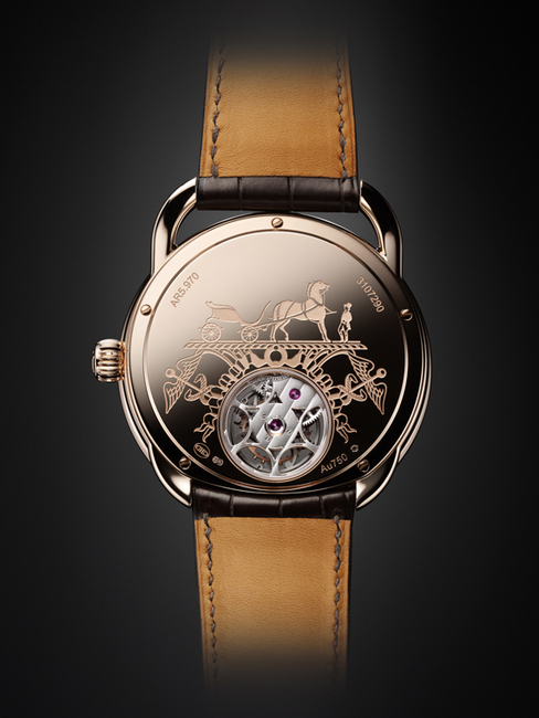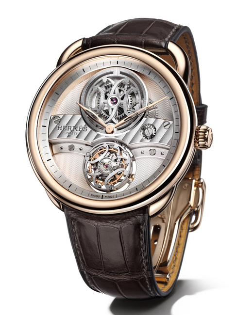 Arceau Lift飛行陀飛輪手錶搭配於愛馬仕鐘錶工作坊精心製作的鱷魚皮錶帶,每一枚的底蓋鐫刻限量編號,全球限量發行176枚。