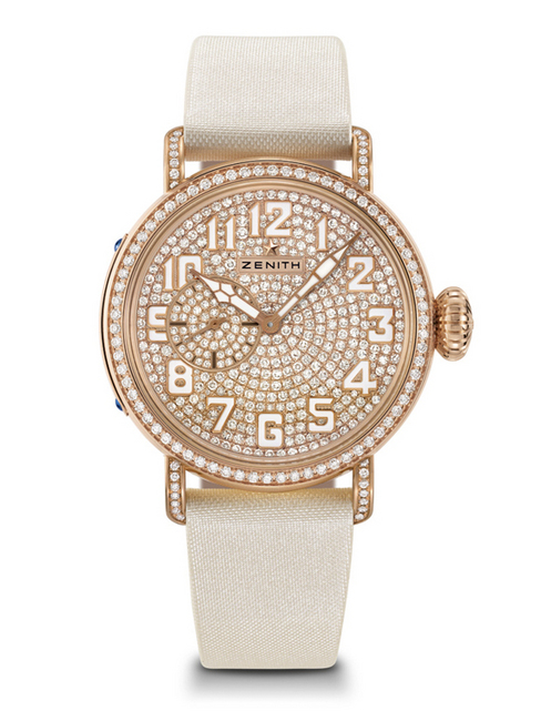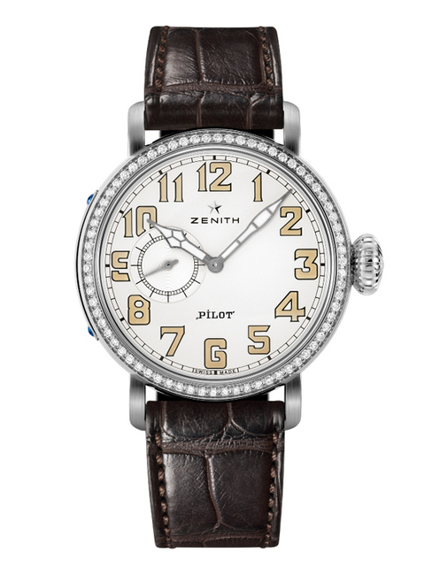 全新女裝錶款猶如一顆在寬闊的天空中燦放光彩的新星。「Pilot Montre d’Aéronef Type 20 40mm 飛行員女裝手錶」搭載尺碼適中的40毫米錶殼,配備古董飛行員手錶標誌性的凸槽錶冠,鐫刻在錶背上的Zenith飛行儀器標誌表示著時計的淵源。全鑲鑽款式彰顯極致優雅的美態,玫瑰金或白金錶盤、錶圈和錶耳上點綴不少於491顆VS級美鑽(約3克拉)。亦備有更為簡約含蓄的款式,銀色錶盤外圈配有鐵軌式時標刻度,而鑽石僅鑲嵌於玫瑰金或精鋼錶圈之上(約0.95克拉),更顯素雅。「Pilot Montre d’Aéronef Type 20 40mm 飛行員女裝手錶」或璀璨奪目,或細膩婉約,複刻大型原創阿拉伯數字時標,並覆有superluminova超級夜光物料,確保在最極端的使用環境下亦清晰易讀。