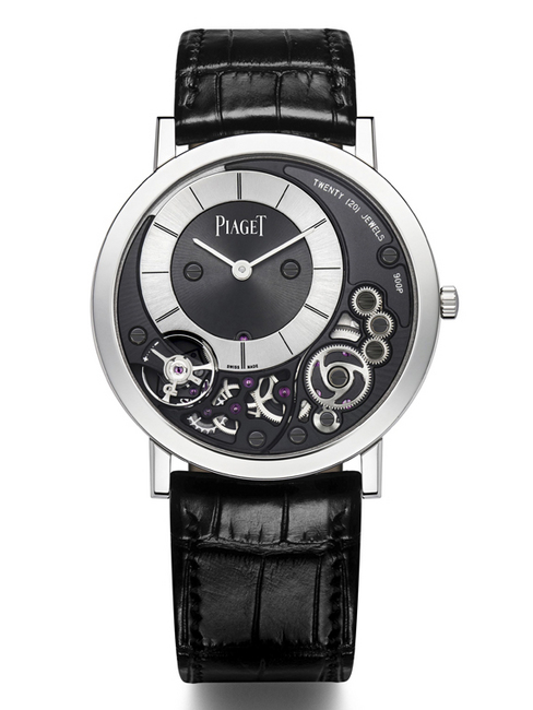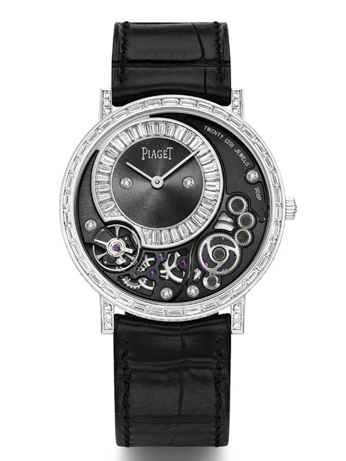 同時兼任主機板的錶底蓋經過霧面拋光及噴砂處理,齒輪則以太陽放射狀或環形波紋霧面拋光交替潤飾。透雕式設計透視機芯精密複雜的機械裝置,錶橋以倒角處理及太陽放射狀霧面拋光修飾,經過黑色塗層處理後,與白金錶殼形成優雅對比。玫瑰金款式則選用碳灰色機械配件,而同款白金鑲嵌寶石款式在錶圈鑲有78顆美鑽,閃耀璀璨光芒。專用動力校正系統鐫刻伯爵「P」字標記,在和諧細膩的高級手錶傑作中突顯品牌身份。
