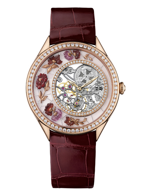 錶盤採用粉紅金掐絲工藝勾勒,上面綴滿花朵圖案的紅寶石、赤銅礦和石榴石。精緻優雅的寶石以寶石雕刻工藝切割和雕琢而成,並點綴著精雕細琢的金質葉子和花蕊,與中國刺繡中用絲線裝飾珍貴面料有異曲同工之妙。葉脈和圓形花瓣體現出對細節的極度關注,為這一裝飾賦予了深邃迷人的效果。精細非凡的紅寶石雕刻工藝是一項巨大的挑戰。每一顆粉紅色蛋白石都經過單獨的切割與研磨,與其他蛋白石密鑲於錶盤之上,寶石之間僅由0.5毫米的白金線作為分割。寶石大師和雕刻大師以令人驚嘆的技藝向中國傳承千年的傳統刺繡藝術致敬。