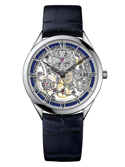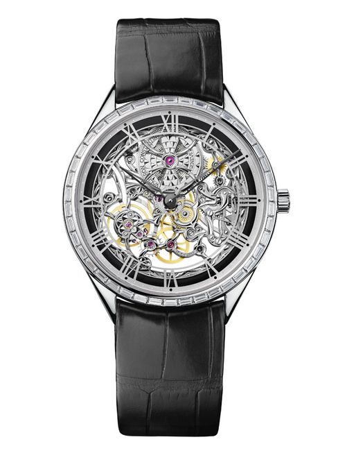 大明火琺琅圓環有黑、藍、灰三色,鏤雕的羅馬數字散發出19世紀後期歐洲大型火車站內中央時鐘那般復古韻味,與承載建築美學意蘊的鏤雕機芯相映成趣。Métier d'Art藝術大師「Mécaniques Ajournées鏤雕機械」系列的高級珠寶款式還加入了另一種工藝寶石鑲嵌,打造成這枚令人著迷的鐘錶傑作。錶圈鑲嵌12顆長方形切割美鑽,與錶扣上的顆長方形美鑽交相呼應,令手錶熠熠生輝,手工縫製的鱷魚皮錶帶則採用騎縫工藝。整枚手錶上的54顆長方形鑽石總重約2.80克拉。